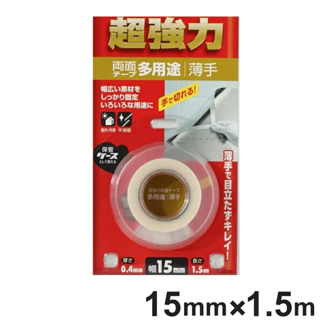✏日用品, 文房具【日本製】両面テープ 多用途 薄手 超強力 0.4mm×15mm×1.5m ( 強力 両面 テープ 超強力テープ 強力テープ 屋内 屋外 外 ベニヤ板 ベニヤ 合板 ガラス日本製 )【MADE IN JAPAN】